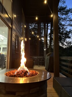 Relax on the outdoor patio featuring a cozy fire pit, comfortable furniture, a BBQ grill, and a dining area perfect for gathering and enjoying the fresh air.